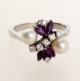 besetzt mit zwei oval-facettierten Amethysten von zus. ca. 3 cts. und sechs Diamanten im 8/8-Schliff von zus. ca. 0,12 ct., ca. 7,3 g