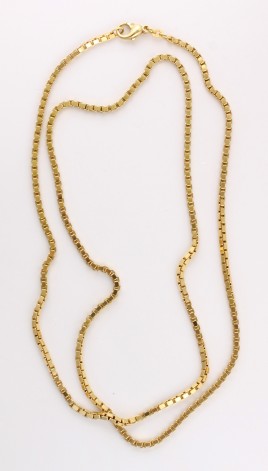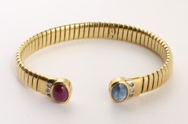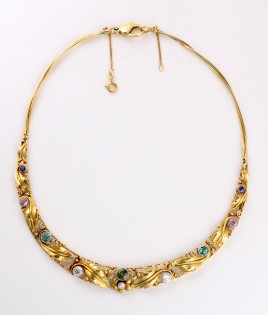 Ringschließe besetzt mit drei Brillanten von zus. ca. 0,02 ct., je einem rund-facettierten Saphir, Rubin und Smaragd von je 0,02 ct., L = 45 cm, ca. 13,5 g