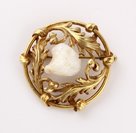filigran durchbrochen gearbeitet, mit einer Lagenkammee, ‚Putto‘, besetzt mit 63 Halbperlen, D = ca. 1,2 – 2,9 mm, und vier oval-facettierten Rubinen von zus. ca. 0,40 ct., ca. 16,0 g, Gebrauchsspuren – Abb. S. 3 –