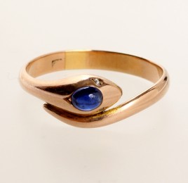 besetzt mit drei Brillanten von ca. 0,15 ct., einem tropfenförmig-facettierten Saphir von ca. 0,20 ct. und einem tropfenförmig-facettierten Smaragd von ca. 0,15 ct., innen mit Widmung EHT, RW 55, ca. 5,5 g, Gebrauchsspuren