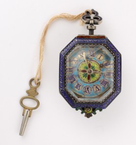 ornamentiert, Reste von farbigem Emailledekor, besetzt mit je einer Diamantrose, je einem oval-facettierten Granat, je vier ovalen facettierten Rubinen von zus. ca. 0,60 ct., zus. drei runde facettierte Smaragde von zus. ca. 0,20 ct. und je fünf barocken natürlichen Perlen, D = ca. 2,3 – 5,5 mm, ca. 19,7 g, restauriert, unvollständig, mit Ergänzungen – Abb. S. 3 –