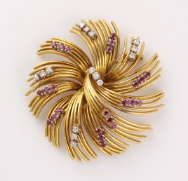 und Silber, ‚Blume‘, besetzt mit einer Diamantrose von ca. 0,60 ct., umgeben von 58 Diamantrosen, L = 7,0 cm, ca. 16,7 g, restauriert, Montage seitlich mit Druckstellen, Ergänzungen