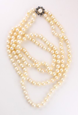 62 Akoya-Perlen, D = ca. 4,3 mm, Mittelteil und Schließe, 19. Jh., 14 K GG, floral, mit weißem Emailledekor, besetzt mit einem Altschliff-Diamant von ca. 0,02 ct. und sieben facettierten Smaragden von zus. ca. 0,35 ct., rückseitig Medaillonfach mit geflochtenem Haar, Schließe mit Meistermarke, L = 20 cm, Smaragde teils bestoßen, mit Ergänzungen