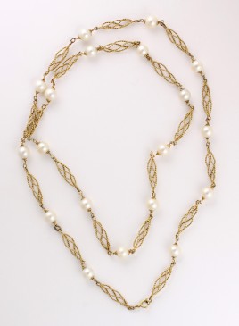 aus natürlichen Perlen, D = ca. 1,5 – 2,0 mm, zwischengefasst 20 Elemente in 14 K Roségold und Silber, besetzt mit je einem oval-facettierten roséfarbenen Turmalin, L = 106 cm, Gebrauchsspuren, ein Strang gerissen