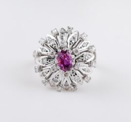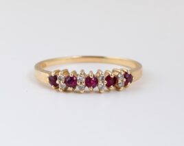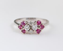 besetzt mit vier Brillanten von zus. ca. 0,25 ct. im mittleren Farb- und Reinheitsgrad, und sechs rund-facettierten Rubinen von zus. ca. 0,25 ct., RW 54, ca. 2,6 g (41709-112)