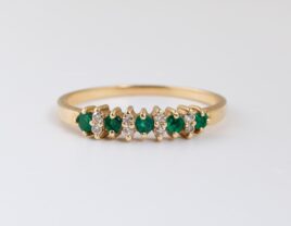 Schauseite besetzt mit acht Brillanten von zus. ca. 0,05 ct., zwischengefasst fünf rund-facettierte Smaragde von zus. ca. 0,10 ct., RW 60, ca. 1,9 g, berieben (41414-11)