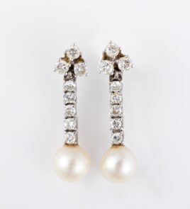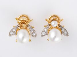 „Bienen“, besetzt mit zus. zwei tropfenförmigen Süßwasserzuchtperlen, H = ca. 10,5 mm, einer Zuchtperle, D = ca. 4,5 mm, und acht Brillanten von zus. ca. 0,30 ct., H = 1,6 cm, ca. 9,6 g, eine leere Fassung (41659-13)