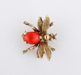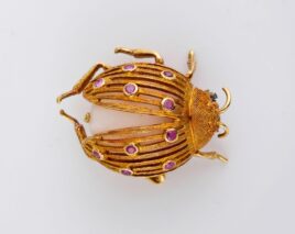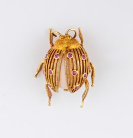 „Käfer“, besetzt mit einer Halbkugel aus roséfarbener Koralle, D = ca. 15,0 mm, und zehn rund-facettierten Rubinen von zus. ca. 0,25 ct., L = 3,2 cm, ca. 11,6 g, leicht verbogen (41659-18)