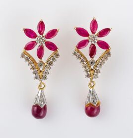 blütenförmig, besetzt mit je sechs Rubin-Navetten (beh.) von zus. ca. 2 cts., je 14 Brillanten von zus. ca. 0,35 ct. im geringen Farb- und mittleren bis geringen Reinheitsgrad, und je ein Rubin-Tropfen (beh.) von zus. ca. 5 cts., H = 3,5 cm, ca. 9,7 g, Gebrauchsspuren (41414-17)