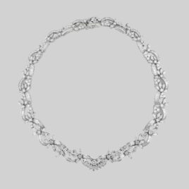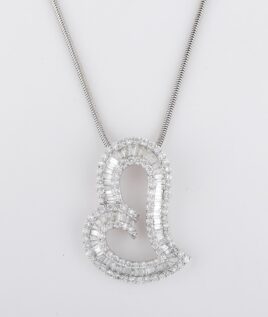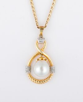 Gliederdekor, L = 52 cm, ca. 7,6 g, dazu Anhänger, 585 GG und WG, besetzt mit 17 Diamanten im 8/8-Schliff von zus. ca. 0,08 ct., anhängend eine tropfenförmige Zuchtperle, H = 9,9 mm, ca. 4,8 g, Gebrauchsspuren (41720-22)