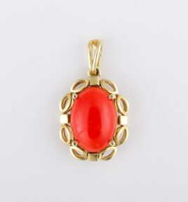 besetzt mit einem ovalen Korall-Cabochon (ca. 8,5 x 5,0 x 2,5 mm), 20,9 x 17,8 mm, ca. 4,1 g, Gebrauchsspuren (41717-39)