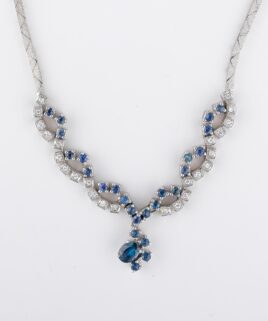 navetteförmige Glieder,einer rundum besetzt mit 16 rund-facettierten Rubinen von zus. ca. 0,70 ct., einer rundum besetzt mit 16 rund-facettierten Saphiren von zus. ca. 0,70 ct., RW 52, zus. ca. 6,3 g, Farbsteine berieben, Rubine mit Kratzspuren (41709-125)