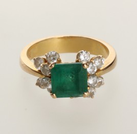besetzt mit einem antikförmig-facettierten Smaragd von ca. 4,50 cts., umgeben von 28 Diamantrosen, RW 56, ca. 5,2 g, Ringschiene restauriert, im Etui – Abb. S. 3 und auf dem Umschlag –
