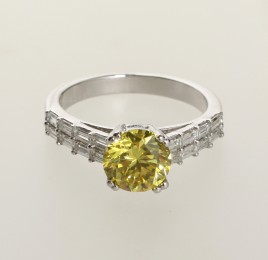 crossover besetzt mit einem facettierten gelben Saphir von ca. 3,30 cts. und einem facettierten Ceylon-Saphir von ca. 2,40 cts., umgeben von zwölf Brillanten und zwölf gelben Brillanten (beh.) von zus. ca. 1,20 ct., RW 58, ca. 9,7 g, Gebrauchsspuren