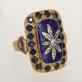 besetzt mit einem oval-facettierten Saphir von ca. 2,50 cts., umgeben von 16 rund-facettierten Saphiren von zus. ca. 0,50 ct. und vier Brillanten von zus. 0,40 ct., RW 50, ca. 7,8 g, Gebrauchsspuren