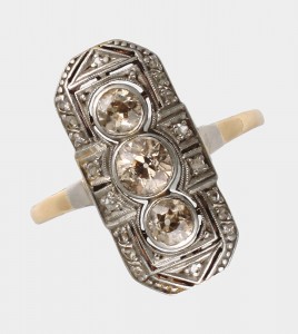 besetzt mit einem Altschliff-Diamant von ca. 0,30 ct., flankiert von sechs Altschliff-Diamanten von zus. ca. 0,25 ct., RW 56, ca. 4,6 g