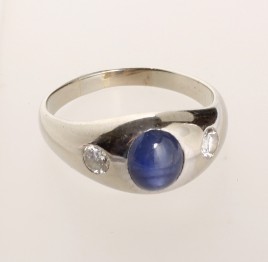 ornamentiert, besetzt mit einem rund-facettierten Saphir von ca. 2 cts., zwei Brillanten und zwölf Diamant-Navetten von zus. ca. 2 cts., durchschnittlich oberer bis mittlerer Farb- und Reinheitsgrad, RW 54, ca. 11,1 g