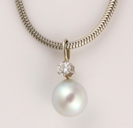mit einem Anhänger, 750 GG, besetzt mit einem Brillant von ca. 0,10 ct. im oberen Farb- und Reinheitsgrad und einer Zuchtperle, D = ca. 8,6 mm, L = 42 cm, zus. ca. 6,4 g