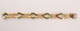 im Mittelteil besetzt mit fünf rund-facettierten Rubinen von zus. ca. 0,50 ct. und acht Diamanten im 8/8-Schliff von zus. ca. 0,06 ct., L = 17,5 cm, ca. 6,6 g, Schließe restauriert