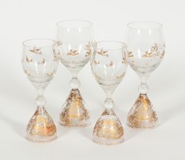 mit Messingbeschlägen, darin vier Glasbehälter, mit rotem Überfang und floralem Golddekor, je beschädigt, 14 x 26 x 14 cm, Risse, Gebrauchsspuren