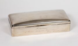 835 Silbermontierung; Buchdeckelapplik, Silber; orientalische Dose, versilbert, 2 x 10 x 10 cm; Holzrelief, Ostasien, ‚Drache‘, montiert, Restvergoldung, L = 24 cm, Risse