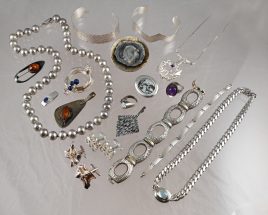 darunter 830 und 835 Silber, wie: Collierketten mit Anhänger, Broschen, Ringe, Armbänder, teils besetzt mit farbigen und farblosen Dekor- und Farbsteinen, brutto zus. ca. 255,2 g, dazu Damentaschenuhr, 800 Silber, teils vergoldet, Werkdeckel Metall, guillochierter Rückdeckel mit ungraviertem Wappenschild, Zifferblatt mit floralem Dekor, Gebrauchsspuren, umgearbeitet, dazu Dose, 800 Silber, L = 5,1 cm, ca. 31,0 g, Gebrauchsspuren, dazu Aschenbecher, versilbert, D = 6,1 cm, Gebrauchsspuren
