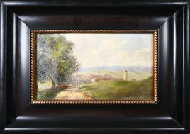 19.Jh., ‚Reisigsammlerin auf dem Heimweg‘, Öl/Lwd., 19 x 25 cm, restauriert; England, 20.Jh., ‚Bäuerin am Gehöft‘, Öl/Hartfaser, 17 x 22 cm