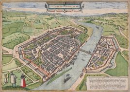 ‚Civitas Francofordiana‘, Kupferstich, handcol., 34 x 49 cm, dazu Johannes Janssonius (1588-1664), ‚Territorium Francofurtense‘, Kupferstichkarte, handcol., 39 x 50 cm, Lichtschaden, gebräunt, fleckig (2)