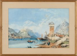 ‚Idyllische Rheinszene‘, Aquarell, 41,5 x 64 cm, restauriert, Lichtschaden, fleckig