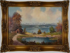 ‚Voralpenlandschaft‘, verso auf Etikett bet., Öl/Lwd., 50 x 70 cm, Druckstelle