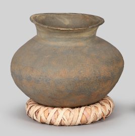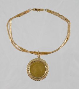 Collier, besetzt mit zwei Grandeln, und eine Brosche, zus. ca. 17,8 g, dazu DAU, Metall, Pratina, mit Lederansatzband, Gebrauchsspuren
