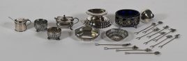 dazu Serviettenring, 800 Silber; Tafelleuchter, 925 Silber, Barockstil, einflammig, gefüllt, H = 5 cm; netto ca. 61 g; dazu verschiedene versilberte Besteckteile, sechs Gläser-Untersetzer, WMF, vier Teile Bürstengarnitur, mit versilberter Montierung, etc.