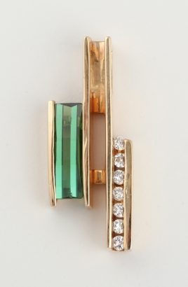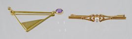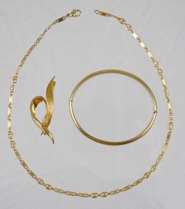 ‚Schilfblätter‘, H = 5,5 cm; Collier, 585 GG, L = 43 cm, zus. ca. 18,4 g; Armspange, 14 K GG, brutto ca. 20,3 g, beschädigt