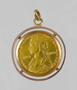 Silbermünzen und drei Grandeln, brutto ca. 184 g; Trachtenschmuck, mit sechs Silber-Kleinmünzen, Deutsches Reich und einer Münze, Schweiz, 5 Rappen; brutto ca. 34,94 g; fünf Silbermedaillen und -münzen, je mit angelöteter Öse, wie: Hl. Georg (2); Patrona Bavaria (2); 5 Mark, Deutsches Reich, Luitpold, Prinzregent von Bayern, 1911, zus. ca. 100 g