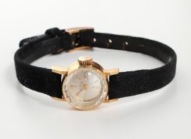 18 K GG, schwarzes Original-Lederband mit Stiftschließe in Metall vergoldet, Ansatzband beschädigt, im Original-Etui