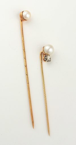 585 und 14 K GG, eine besetzt mit einer Boutonperle, D = ca. 5,4 mm, eine besetzt mit einer Zuchtperle, D = ca. 6,1 mm, und einer Diamantrose, zus. ca. 2,8 g, zwei Schieber in Metall ergänzt