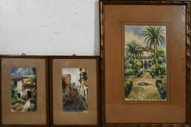 ‚Ansichten in Sevilla‘, drei Aquarelle, 16,5 x 9,5 cm (2) und 28,5 x 16 cm