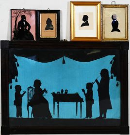 Silhouettenbilder, 19.Jh., ‚Portraits‘, 5 x 3,5 cm bis 31 x 43 cm, gebräunt, fleckig (5)