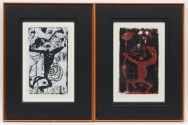 je verso und handsig., dat. (19)95, geb. 1952 bzw. 1957 in der Provinz Guanxi – tätig u.a. in Chicago, ‚Figuren‘, zwei Farbholzschnitte, je 6/15, je 35 x 20 cm