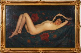 ‚Akt auf Blütenmusterdecke‘, Öl/Malktn., 34 x 55 cm, Kratzspuren
