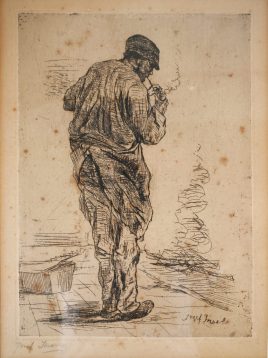 Bremen 1893 – 1963 Paris, ‚Männerbildnis‘, Kaltnadelradierung, 23,5 x 15,5 cm, und Gerd Hanebeck, eines m.u.sig. und dat. (19)77, Remscheid 1939 – 2017 Wuppertal, ‚o.T.‘, zwei Werke, je Öl und Collage/Lwd., je 20 x 20 cm; Gerd Hanebeck, r.u.handsig., dat. (19)77, Remscheid 1939 – 2017 Wuppertal, ‚Flugfigur‘, bet., Radierung, Probedruck 1/8, mit Widmung, 20 x 27,5 cm, je gebräunt, fleckig (4) *36 und 38*