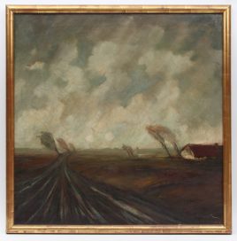geb. Mainburg 1939, ‚Dachauer Moos‘, Öl/Holz, 25,58 x 49,5 cm