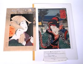 ‚Damenportrait nach F. Boucher‘, Farblithographie, 20 x 15 cm, dazu Bebi nach Ehmannt, ‚Frankfurt am Main‘, gedruckt bei F.G. Bottinelli, 29 x 41 cm, je gebräunt, fleckig