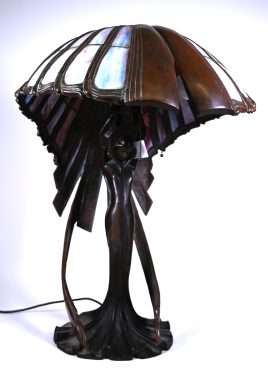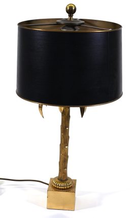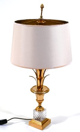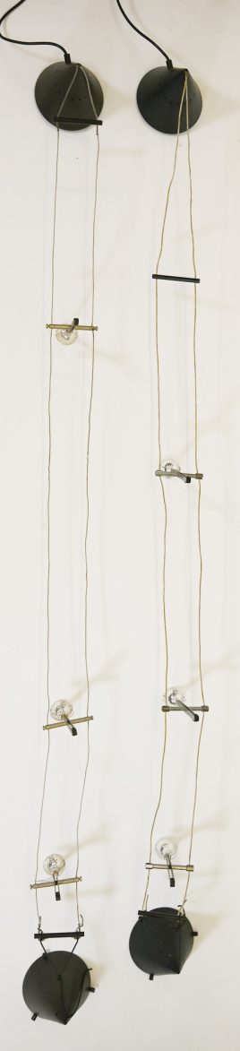 mit Prismen, dreiflammig, H = 37 cm; D = 38 cm, unvollständig; Deckenampel, Metall, teils farbig gefasst, mit Glasscheiben, dreiflammig, H = 82 cm, unvollständig