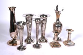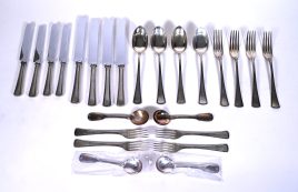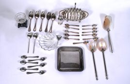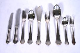 wie: Menuemesser, -gabeln und -löffel, dazu sechs Kaffeelöffel und vier Vorleger, sowie weitere einzelne Besteckteile, meist versilbert, Gebrauchsspuren