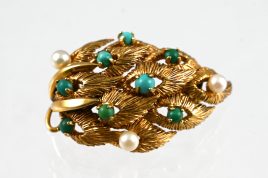 Collierketten, Ringe, Ohrstecker, -clips und -hänger, Manschettenknöpfe, Anhänger, Haarklammer, Broschen, Armreifen und -bänder und Krawattennadeln, darunter Swarovski, teils Metall vergoldet, Zuchtperl- und Türkisimitationen, teils gefärbte Süßwasserzuchtperlen, Hämatit, Rhodochrosit, Pressbernstein, Bein, Emaille, Holz, Muscheln, Koralle, Karneol, farbige und farblose Dekorsteine, teils beschädigt, teils im Etui