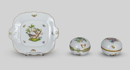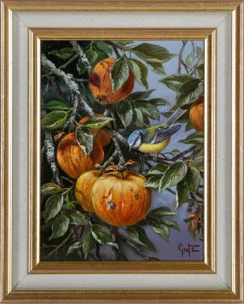 „Stillleben mit Trauben, Pfirsichen und Pflaumen“, Öl/Holz, 18 x 23 cm; Grate, r.u.sig., „Vogel im Apfelbaum“, Öl/Holz, 24,5 x 18,5 cm (Abb.) (2) (41530-14)