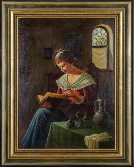 „Lesende mit Perlschmuck, Zinnkrug und Weinglas“, Öl/Lwd., aufgezogen, 41 x 31 cm (41530-7)