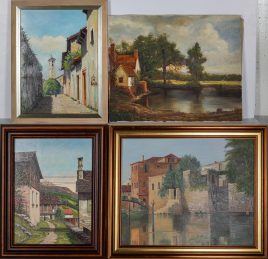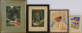 Josephine Schalk, r.u.mon., „Waldweg“, 18 x 13 cm (PP-A.), Lichtschaden; H. Hoffmann, r.u.sig., „Sommerwald“, 16 x 11,5 cm, eingerissen; sowie unbekannte Künstler, „Herrenportrait“, 14 x 15 cm; Robert Wosack, „Ritter zu Pferd“, 14 x 9 cm, gebräunt, Lichtschaden (4) (41486-46)