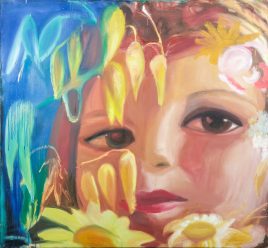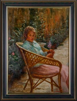 „Mädchen im Korbsessel vor blühenden Topfpflanzen“, Öl/Lwd., 70 x 50 cm (41530-4)